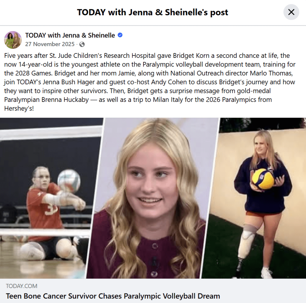 It is always fantastic to hear stories of some of the kids that St. Jude has helped. One such story is that of Bridget Korn, an amazing young lady who underwent treatment at St. Jude’s five years ago and is now the youngest athlete on the US Paralympic volleyball development team, training for the 2028 Games.